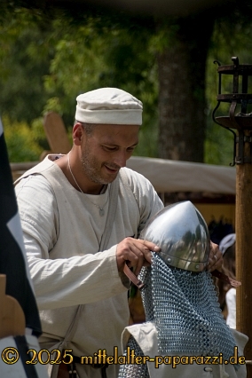 Wer sich traut, darf bei uns gerne selbst einmal in die Rolle eines Ritters schlüpfen: Eine Kettenhaube überstreifen, einen Helm aufsetzen, ein Schild greifen und ein Schwert halten – natürlich alles in sicherer, kindgerechter Ausführung.