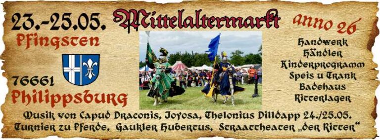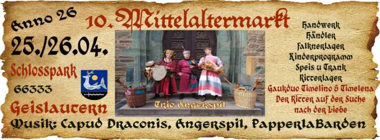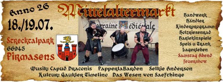 Wir sind auf mehreren Veranstaltungen der „Lorraine Medievale“ Agentur für Mittelaltermärkte zu finden. Für weitere Informationen über die Agentur sowie weitere Märkte von „Lorraine Medievale“ einfach hier klicken. Für weitere Informationen über den jeweiligen Markt unten einfach auf den Banner klicken.